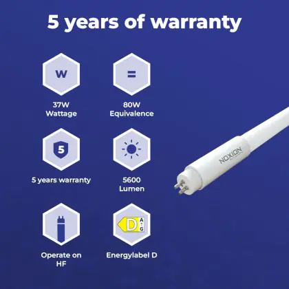 Il Noxion Avant LEDtube T5 Avant Extreme Electronic (HF) Ultra Output 37W 5600lm - 840 Bianco Freddo | 145cm - Sostitutiva 80W è un tubo LED perfetto per sostituire gli standard tubi fluorescenti di 80 W. Con questo tubo LED di Noxion ti assicuri una lunga durata e 5 anni di garanzia.